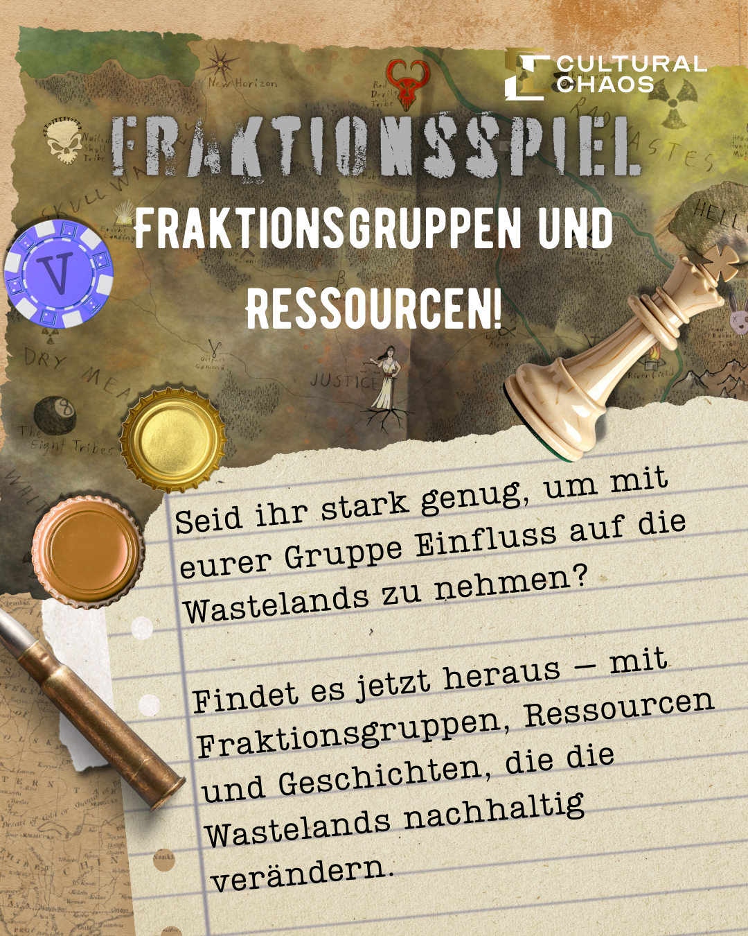 Mit Fraktionsgruppen erweitern wir Wasteland Stories um ein optionales, langfristiges Spielangebot. Gruppen ab 5 Personen können als Fraktion auftreten, Ressourcen sammeln, Beziehungen aufbauen und den Verlauf zukünftiger Wasteland Stories aktiv beeinflussen.